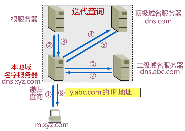 域名查询有递归查询(recursive query)和迭代查询(iterative query)两种方式。其中主机向本地域名服务器的查询一般采用递归查询;本地域名服务器向根域名服务器的查询可以采用递归查询,但更多地采用迭代查询。