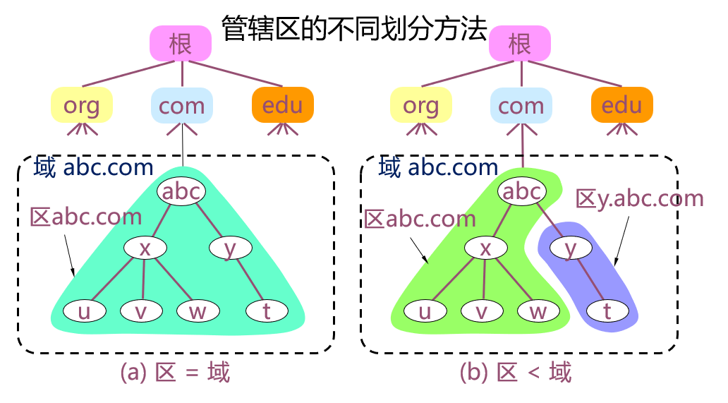 一个域名服务器所负责的范围称为区 Zone ,区是域的子集,可以等于域,但不能大于域。各个单位可根据自己的具体情况把本单位域名划分为若干个域名管辖区,每个区都设置一个权威域名服务器。