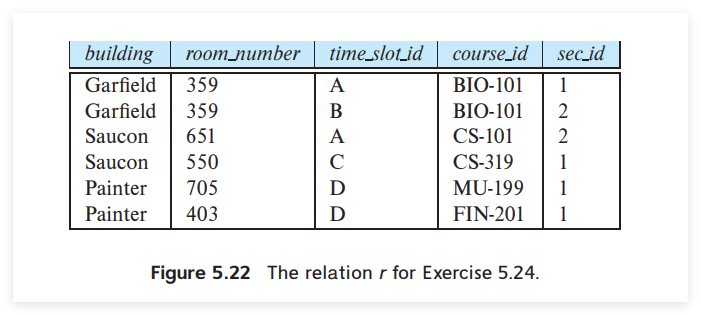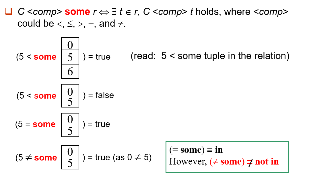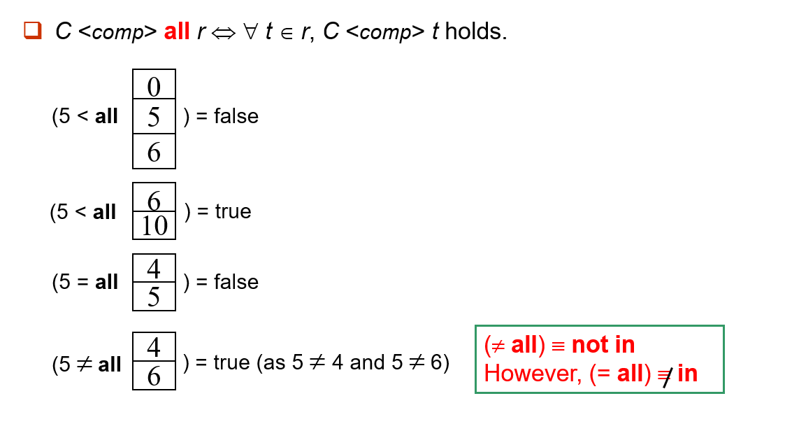 ,分别对应着并集 \(\cup\),交集 \(\cap\),以及差集 \(-\)。与其他操作不同的是,set operations 会自动隐去重复的元素,如果我们想保留重复元组,则需使用 UNION ALL
