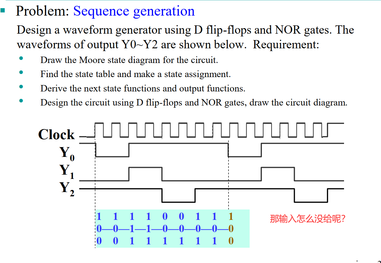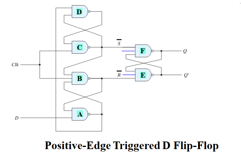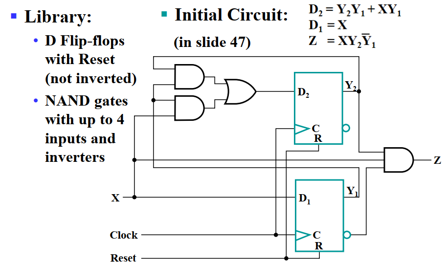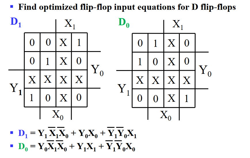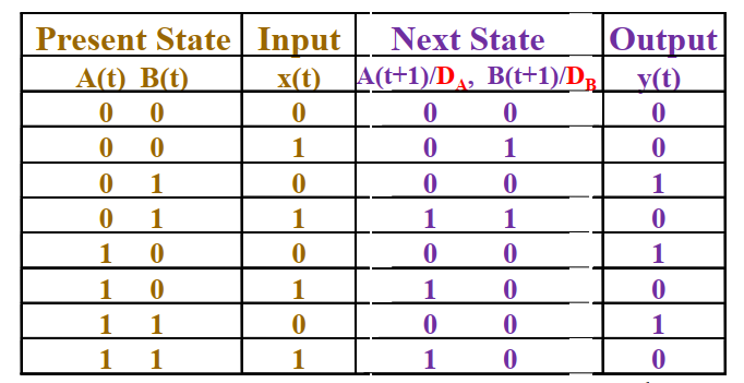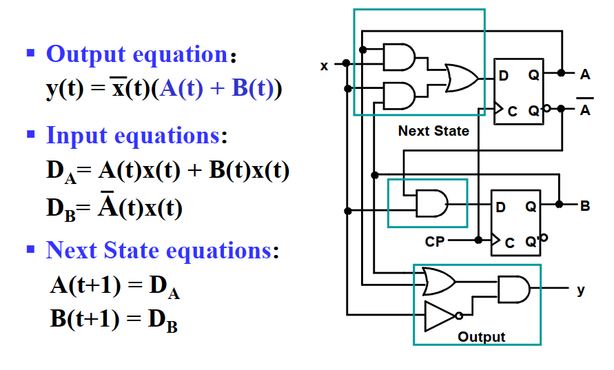 - 通常使用D触发器来作为时序元件,其中D触发器的input通常为Next State的值,即\(D(t)=Y(t+1)\)