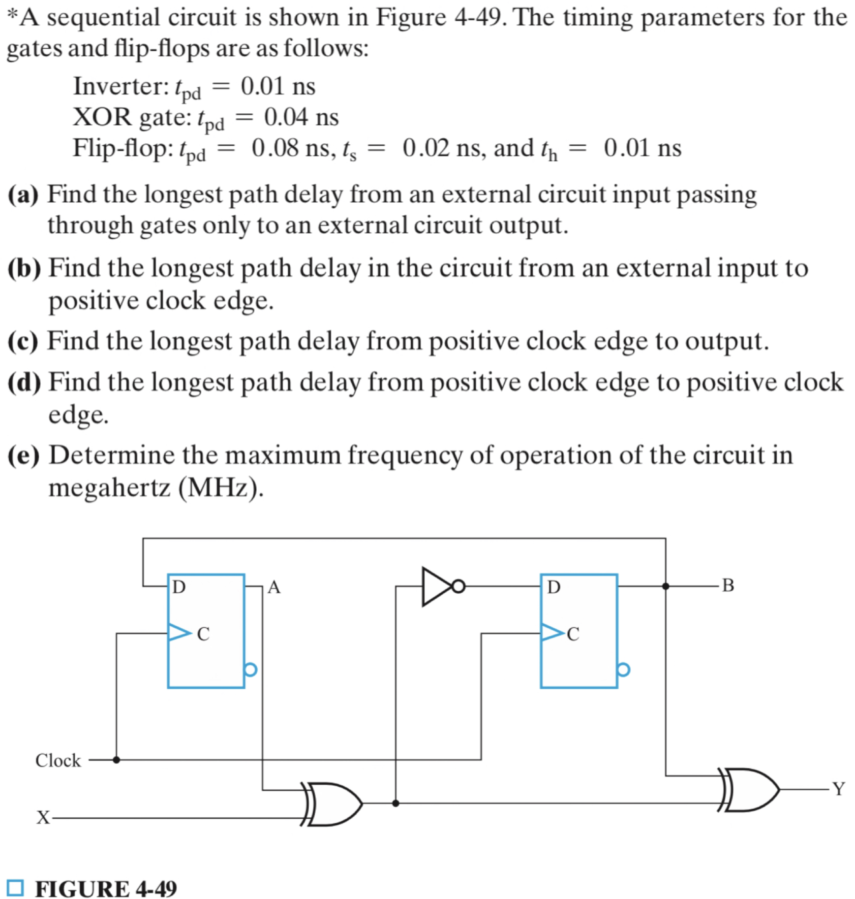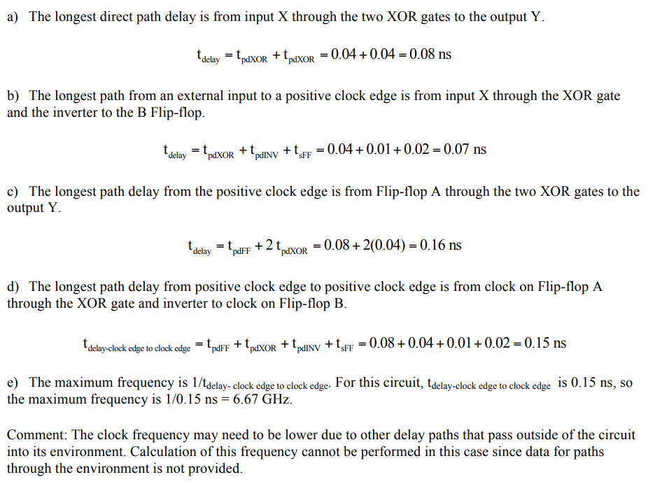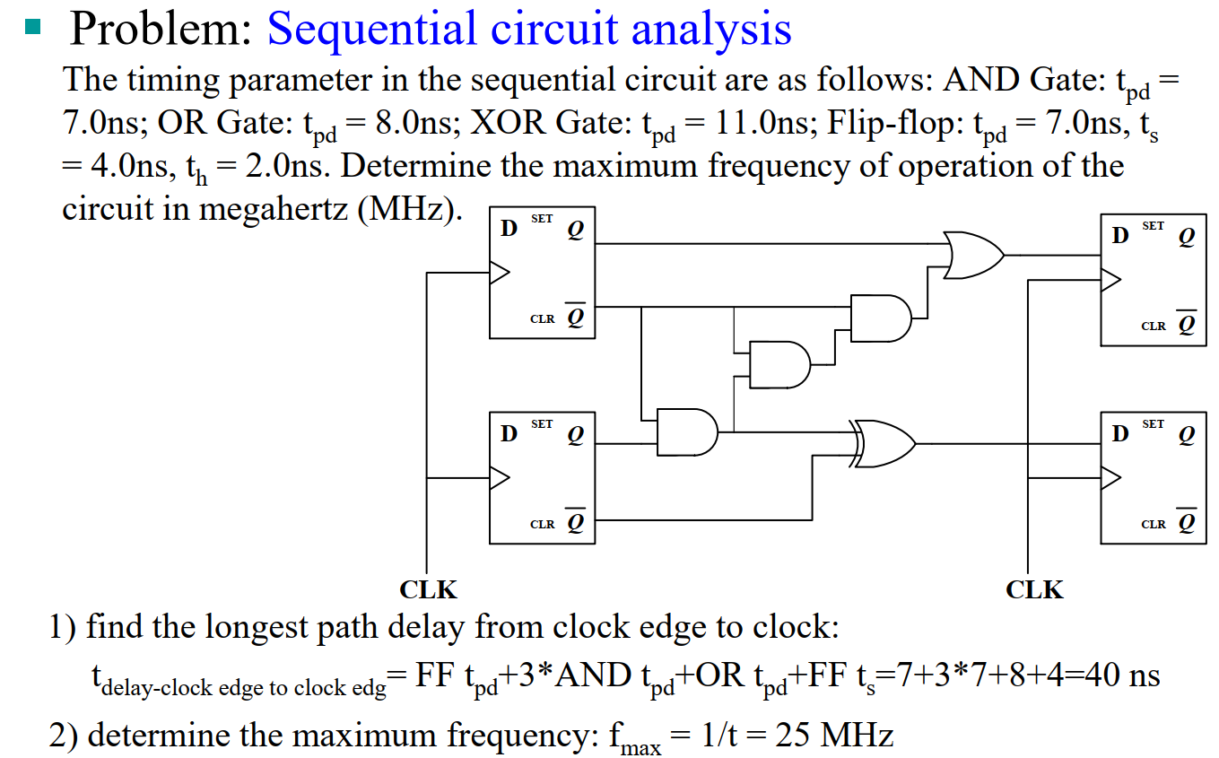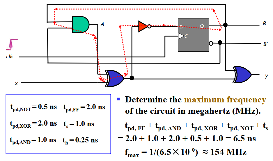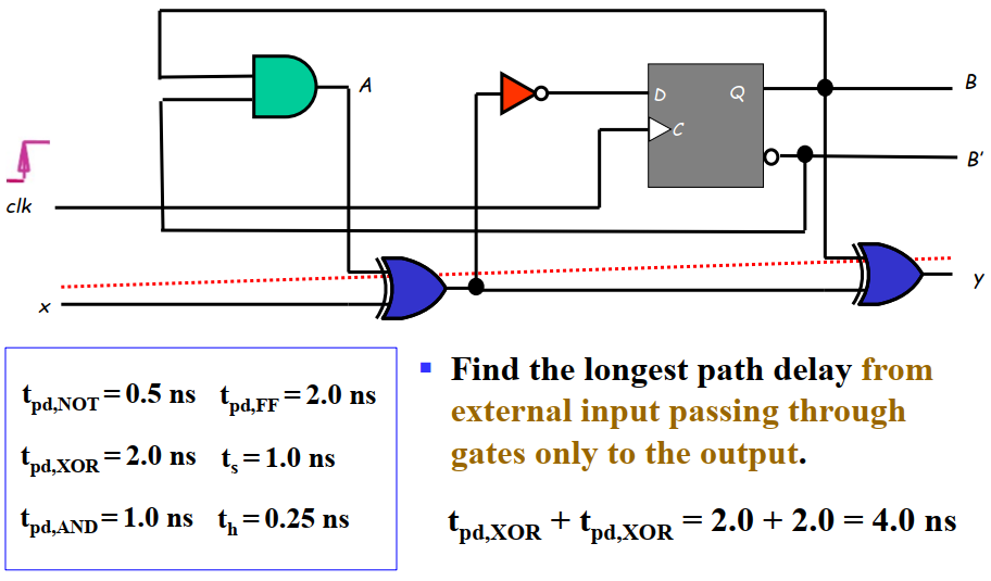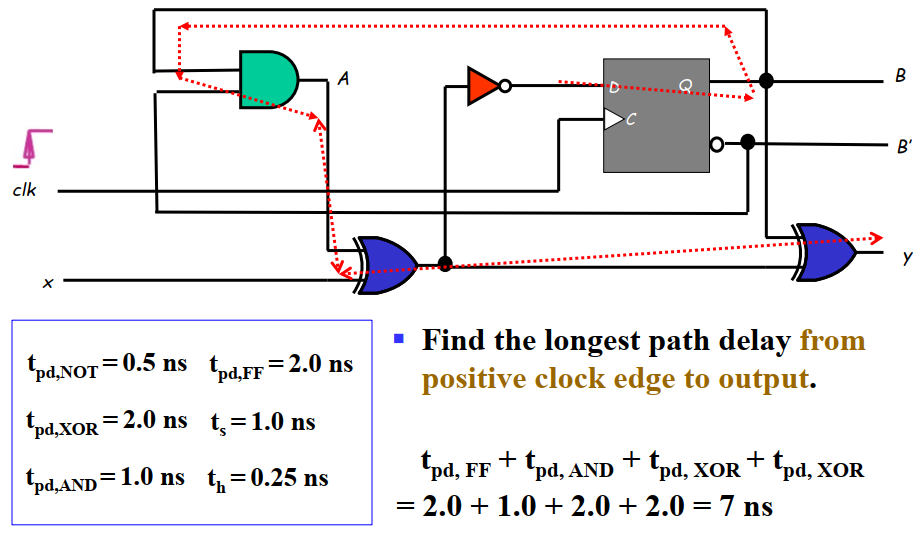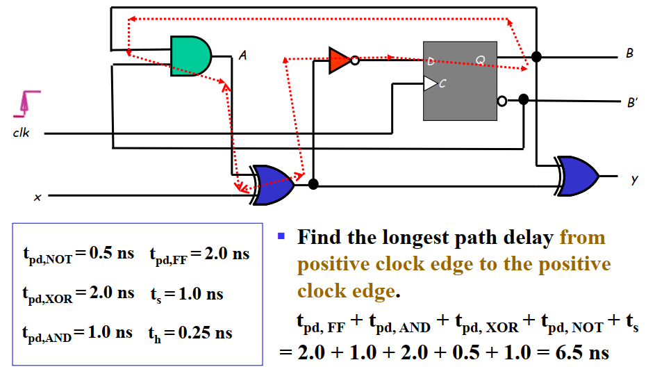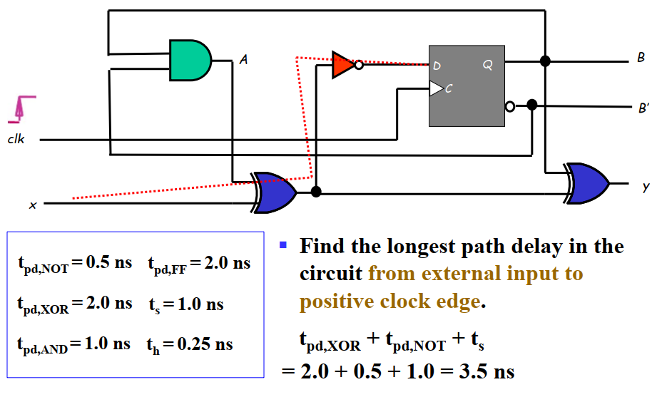 稳定下来所需要的时间 - \(t_{pd,COMB}\) - combinational logic delay - 从触发器输出到返回输入路径上所有组合逻辑的传播延迟