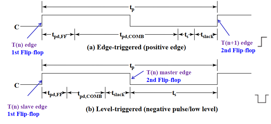 - For every Flip-flop \(t_p\ge t_{slack} +(t_{pd,FF} +t_{pd,COMB}+ t_s)\)