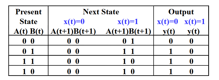 Present State | Next State x=0 | Next State x=1 | Output x=0 | Output x=1 |