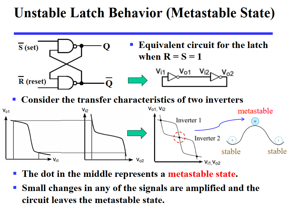 以上两种锁存器都存在一个问题,就是对于S/R某种输入存在不确定状态,并有可能产生介稳态(metastable state)