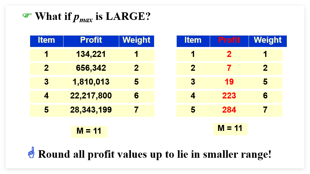 虽然看上去是多项式时间复杂度,但是由于 \(p_{max}\) 的值往往远大于 \(n\) ,可能会达到指数级别。这时,我们可以选择牺牲一些精度,将 \(profit\) 做一些舍入(向上取整)从而得到更小的 \(p_{max}\) :