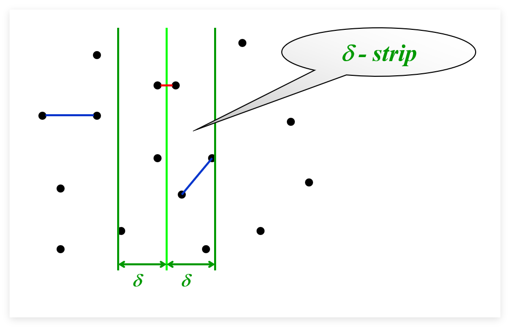 由于我们已知左右两侧平面点之间的最小值,那么整个平面的距离最小值不会大于这个值。选取已知最小值小的那个 \(\delta\) 作为阈值,在分割线左右两侧划分一个范围,且超出这个范围的点都不会在考虑范围之内: