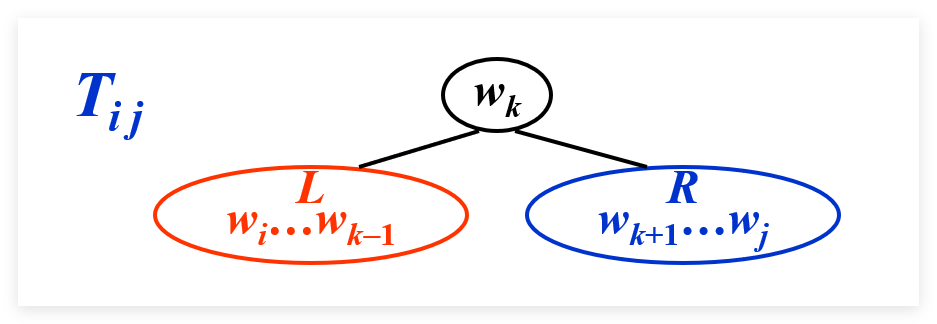 \[\begin{array}l c_{ij} &=p_k +cost(L)+cost(R)+weight(L)+weight(R) \\ & = p_k +c_{i, k-1} +c_{k+1, j} +w_{i,k-1} +w_{k+1,j} \\ & = w_{ij} + c_{i,k-1} +c_{k+1, j} \end{array}\]