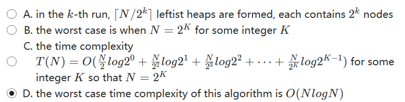 - [F] For leftist heaps and skew heaps, the worst-case running time of a single insertion are both O(N)