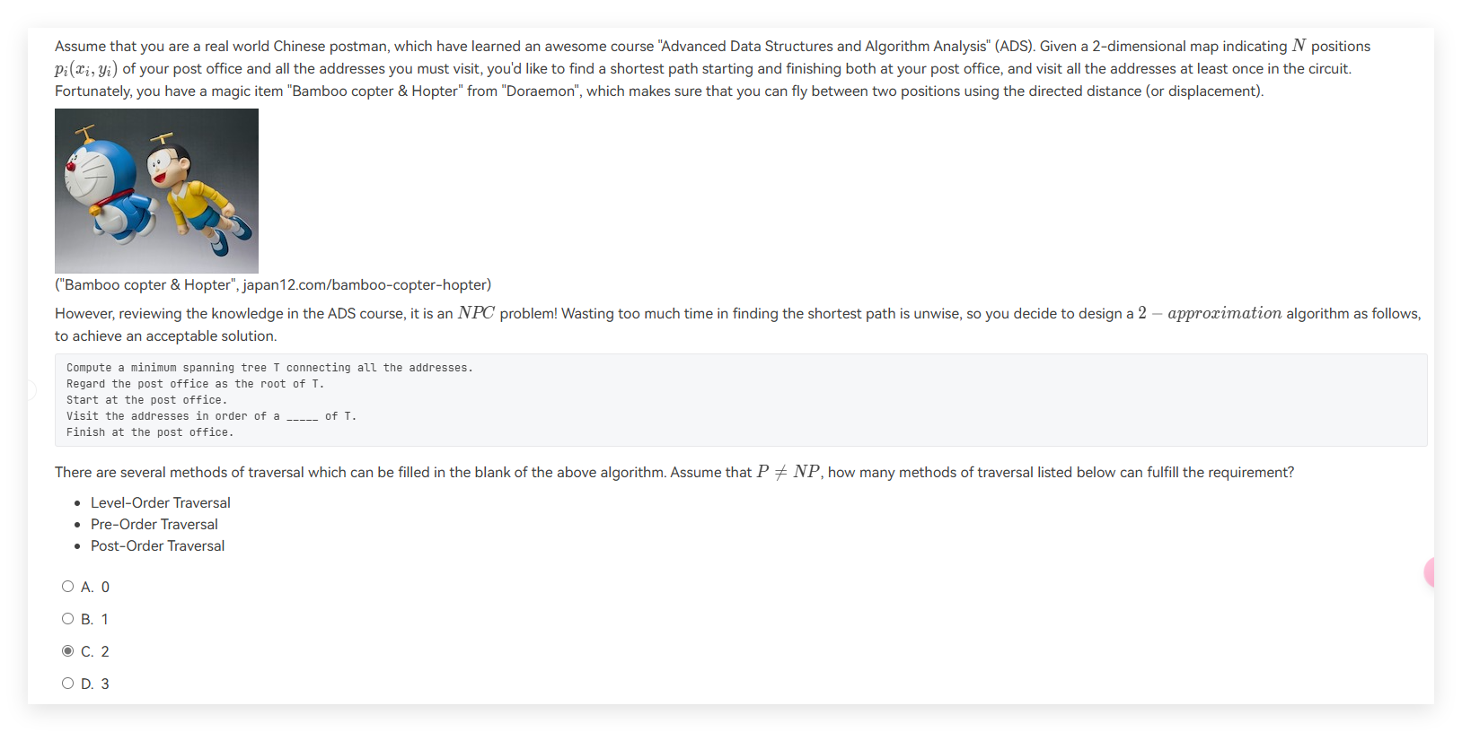 - 遍历最小生成树,回溯的时候可能会把一条边走两次(也可以理解成两点之间直线最短),所以该算法近似比为2。但是如果用层序遍历,就完全不走准确解的最小生成树的边了。