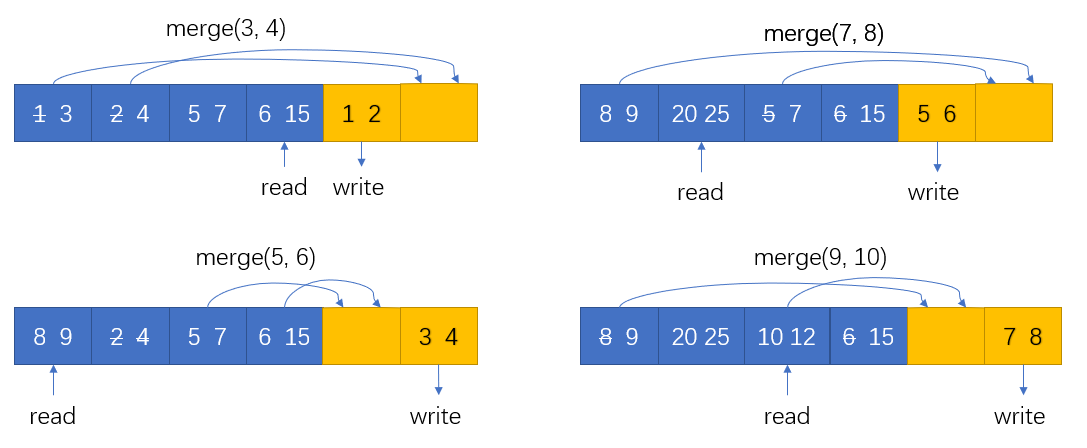 - A. 1 and 2 are written onto the third tape; 3 and 4 are merged into an output buffer; 6 and 15 are read into an input buffer