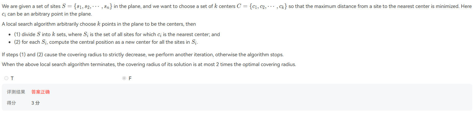 - 用 Local Search 求解 K-center 的近似比可以是 2 吗???并不能,可以举出反例。