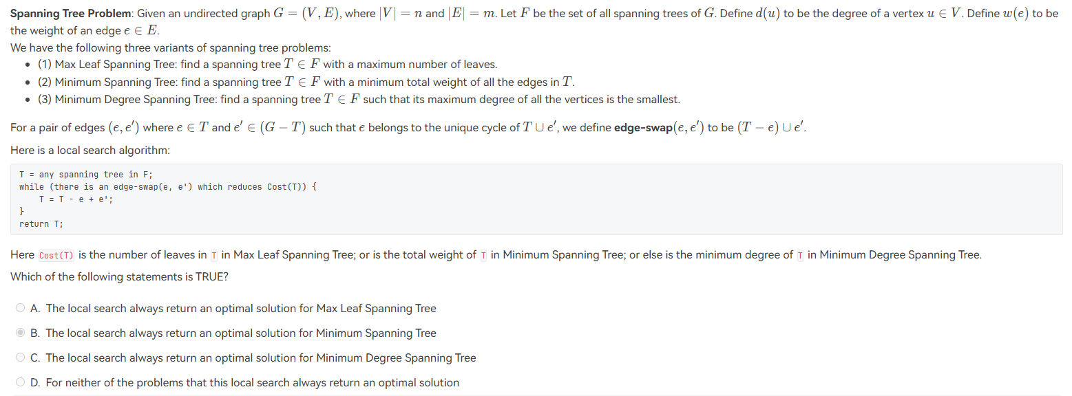 - 神秘题目。从势能函数上考虑,只有最小生成树问题的 cost 函数只有一个极小值的,所以不会陷入局部最优解