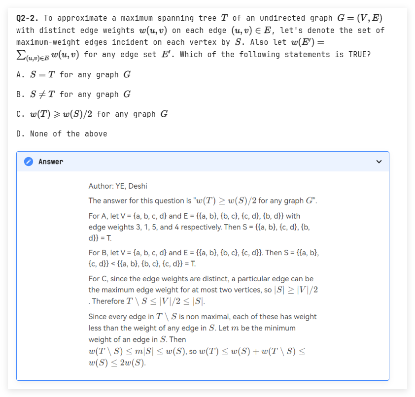 - (T) For any undirected graph G, the weight of its maximum cut is at least half of the total edge weight.