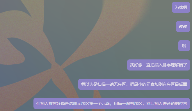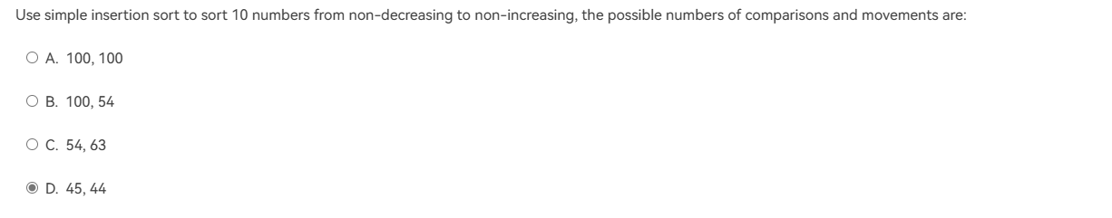 - 选择插入排序,假设该序列已经递增排完序,逆序对为0,插入排序每轮在有序区从后往前比较,由于无序区第一个元素比有序区最后一个元素要大,直接把该元素插入有序区,不需要再跟前面元素比较,也不需要交换即可完成一轮排序,时间复杂度为 \(O(N)\)