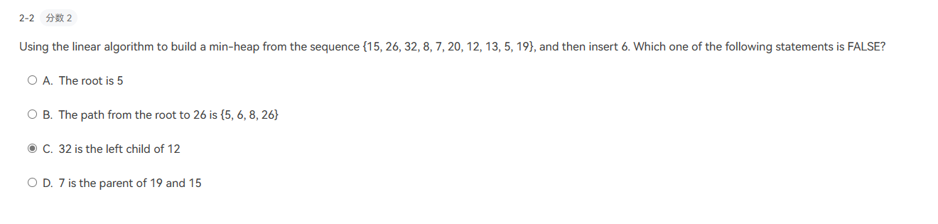 - (Answer : 4) 对四个元素使用\(O(N)\)建堆方法,最多需要比较多少次
