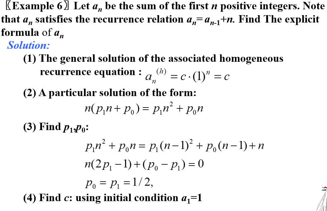 - Solve: 找特解 \(a_n^{(p)}\)(Particular),再求不含 \(F(n)\) 的递推的通解 \(a_n^{(h)}\),则通解为 \(a_n^{(p)} + a_n^{(h)}\)