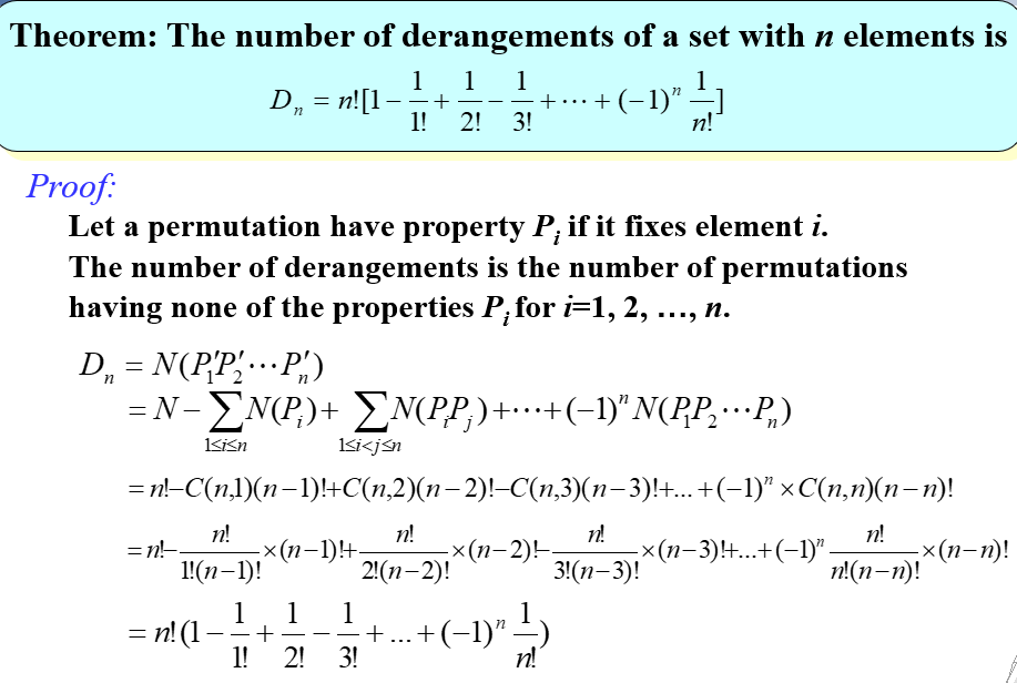 以 \(N(P_i)\) 表示满足 \(P_i\) 的个数,则有 $$ N(P_1' P_2'... P_n')=N- |A_1 \cup A_2\cup ...\cup A_n|=N- \sum_{1\le i\le n} N(P_i)+\sum_{1\le i\lt j\le n} N(P_i P_j)-...+(-1)^nN( P_1 P_2...P_n) $$