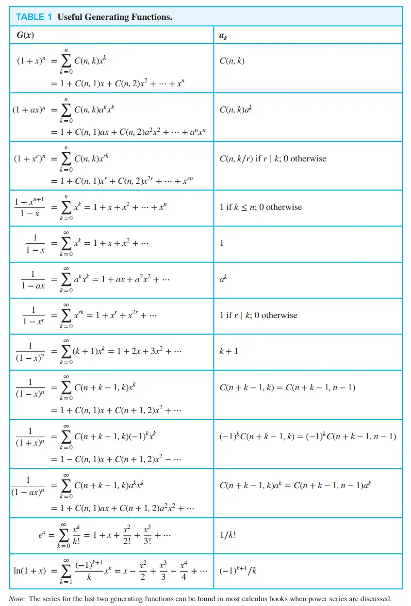 - For sequence \(a_0, a_1, a_2, ...,a_k,...\),its generating function is: \(G(x)=a_o +a_1x+ ...+a_kx^k+ ...=\sum_{i=0}^{\infty} a_kx^k\)