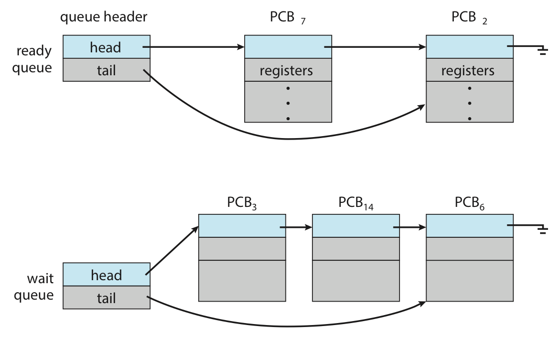 进程在 ready 状态时需要等待 CPU 资源的派发;在 waiting 状态时需要等待对应 I/O 完成或事件完成。我们通常使用链表作为数据结构对 Ready Queue 和 Wait Queue 进行维护: