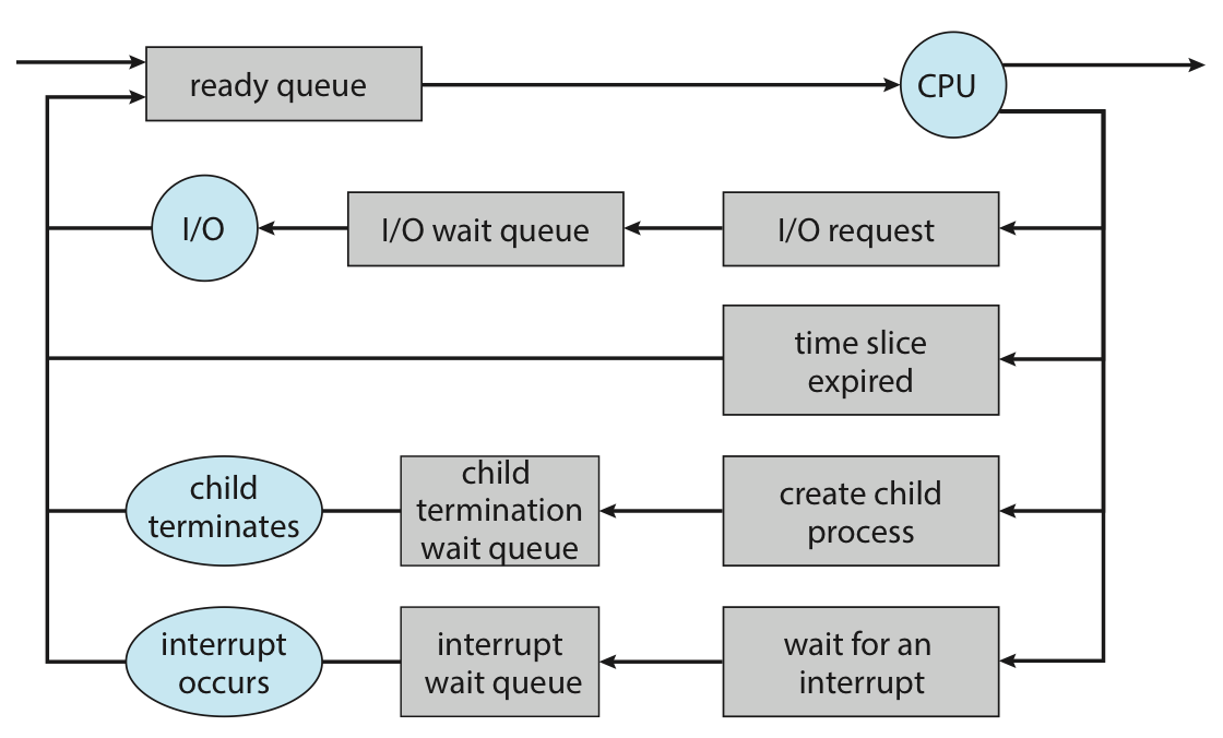 实际上,不同进程会因为不同的时间而等待,因此 Wait Queues 实际上存在很多条;在结束 Waiting 后,进程就会进入 Ready Queue,因此实际情况可能如下: