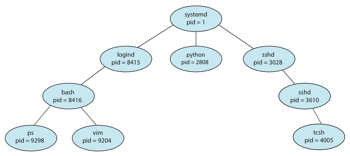 子进程本身也可以再创建新的进程,于是整个系统里的进程就形成了一个 树状结构(process tree),例如: