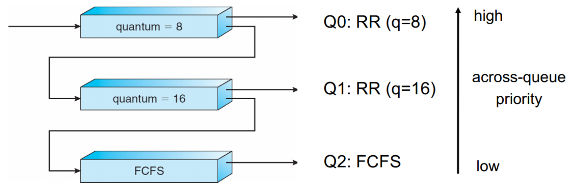一个进程 Ready 时先进入 \(Q_0\),该进程后获得 CPU 有 8ms 时间完成任务,否则被打断进入 \(Q_1\);只有当队列 \(Q_0\) 中所有进程执行完时才会运行 \(Q_1\),进程在 \(Q_1\) 同理,如果没在 16ms 完成任务则进入 \(Q_2\);最后 \(Q_2\) 采取 FCFS 算法,只有 \(Q_0,Q_1\) 均为空时才会被执行。