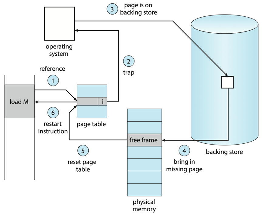 在请求分页系统中,每当要访问的页面不在内存中时,便会产生一个 Page Fault,其处理流程为: