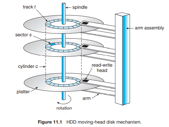现代计算机的二级存储基本选用 Hard Disk Drives, HDDs 或 Non-Valatile Memory, NVM,在这里我们主要关注 HDD 的结构与相关访问时间量化。