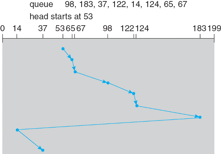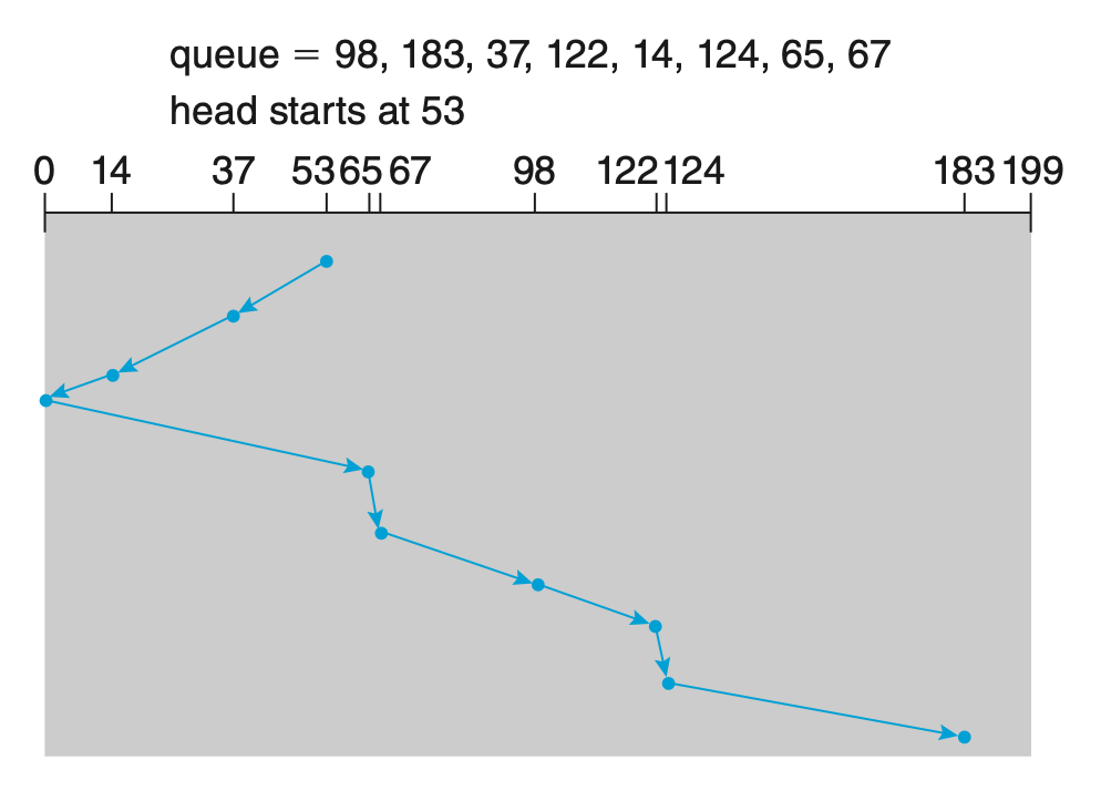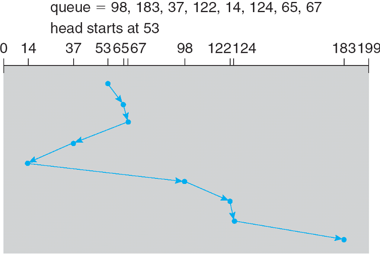 - 存在饥饿现象,因此对于磁盘调度不能说是 Optimal Algorithm