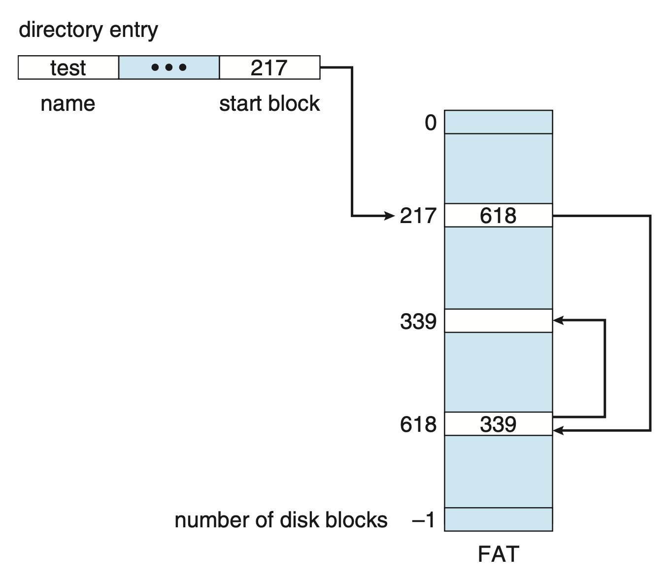 - 变体 - FAT (File Allocation Table): 将所有指针提取出来放在内存的一张表中(FAT 表)。这样在内存中查表就能实现较快的随机访问。MS-DOS 和早期的 Windows 使用此方式
