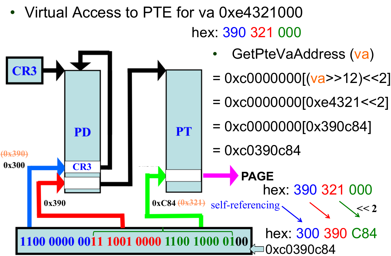 为了解决这个问题,OS 为 Page Table 设置了一个 self-reference table entry,这个 entry 存储了指向自己所处的 Table 的基地址。Windows 32 bit 将 0x300 entry 作为 self-reference table entry,我们接下来也将以此为例作为讲解。