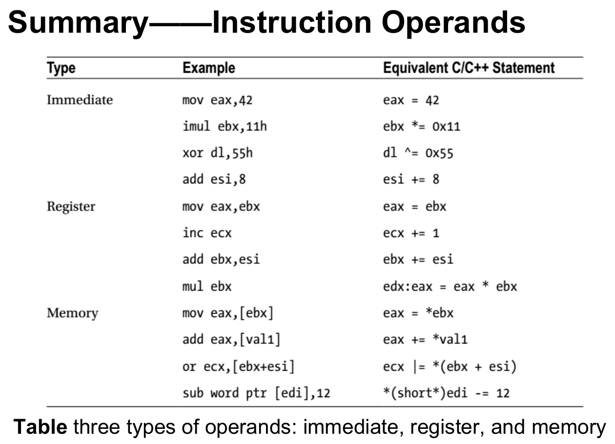 - register, memory, immediate(立即数只能入栈,不能出栈)
