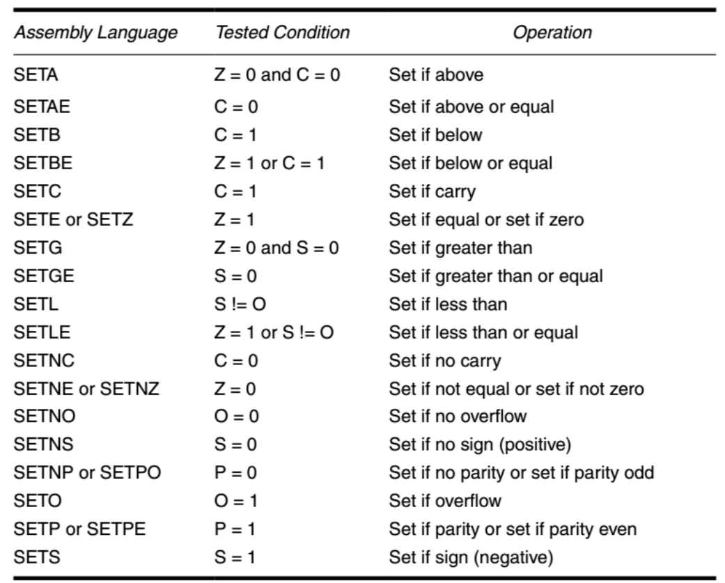cc,则将 op 置 1;反之置 0- 例如 setc eax 对 CF 进行检测,效果等价 eax = CF