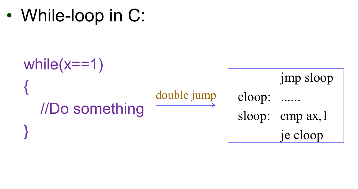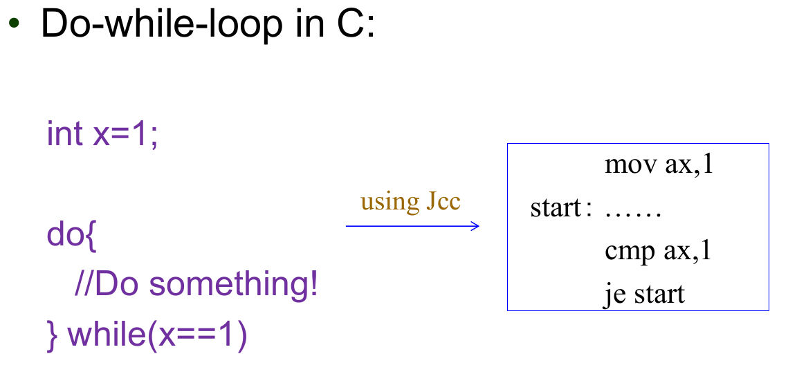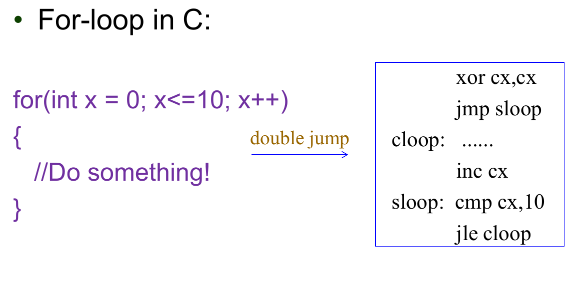 - 注意: 先作减法,再判断是否为0,因此将CX赋值为0可循环的次数最多(1+FFFF);如果不希望CX为0时进入循环,应该在进入循环前使用