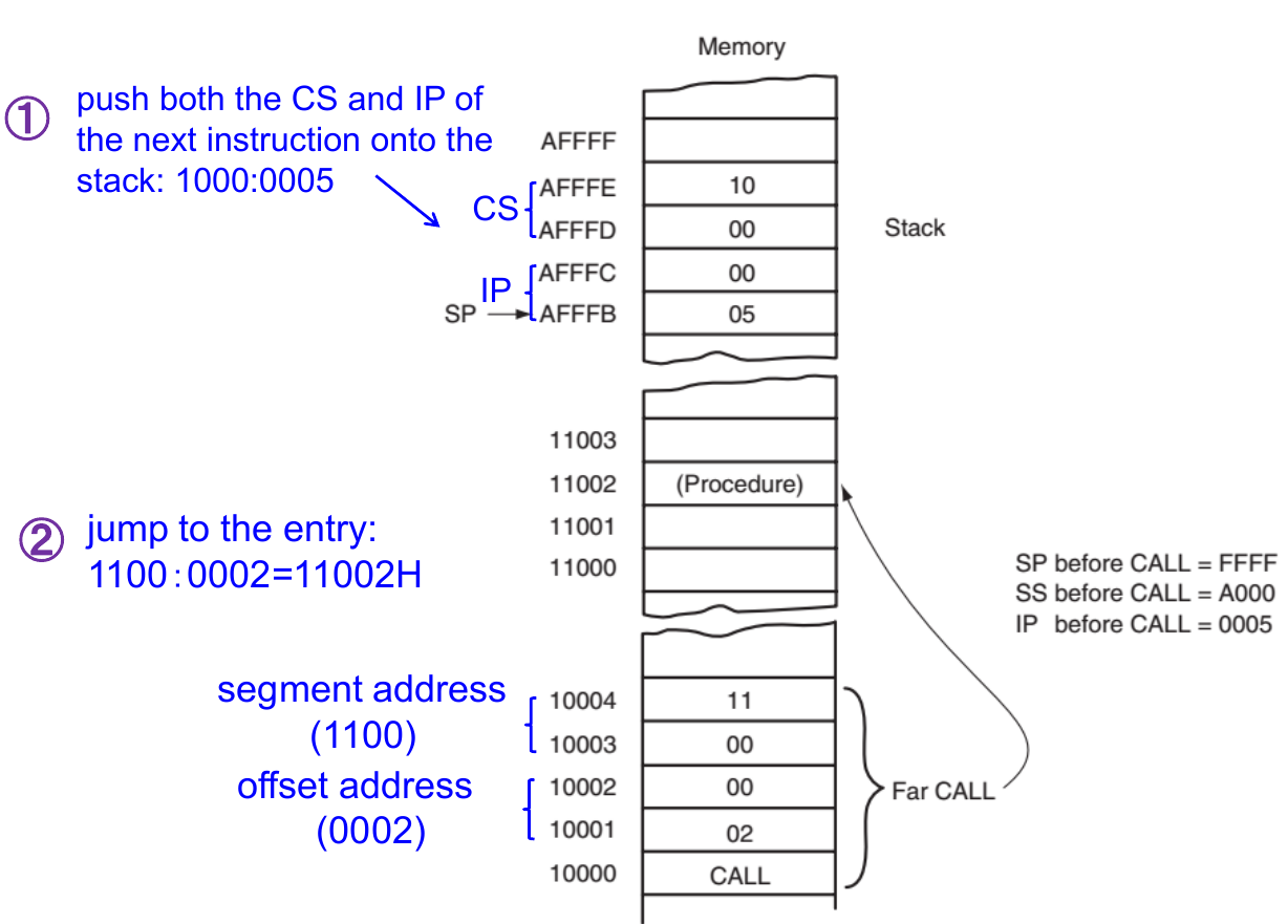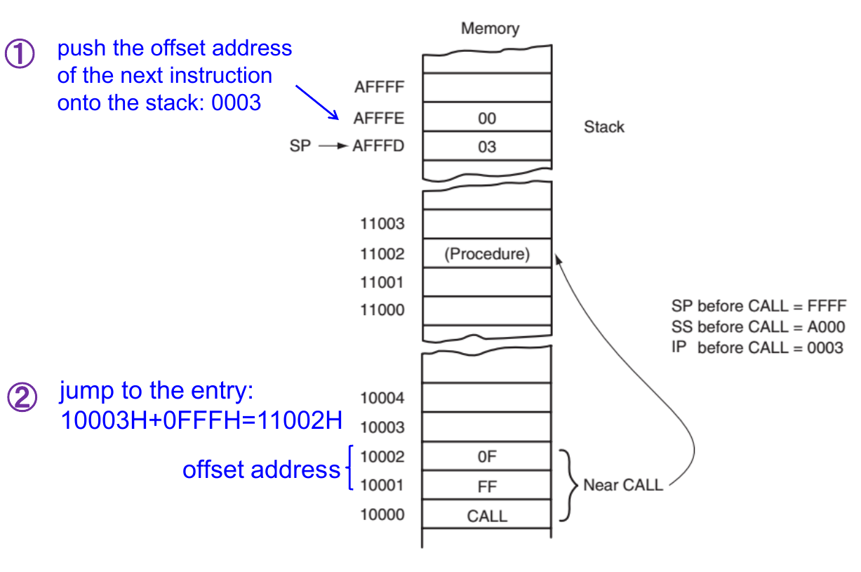 与跳转指令不同的是,CALL 指令会将返回地址(下一条指令的地址)也压入栈中;当过程调用返回,调用 RET 时,会自动从栈中取出返回地址。