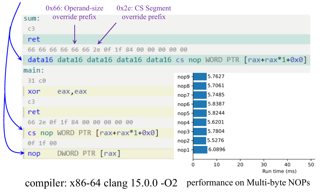 多字节 NOP 指令常用对齐边界的填充。Intel Optimization Reference Manual 中推荐的多字节 NOP 指令的机器码为: