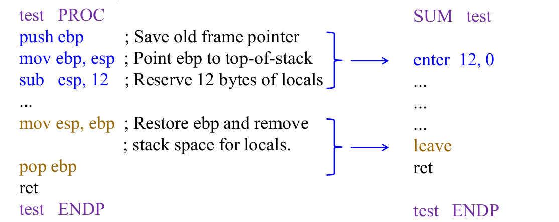 ENTER 和 LEAVE 指针用来为被调用的过程建立/释放栈帧。栈帧由以下部分组成: