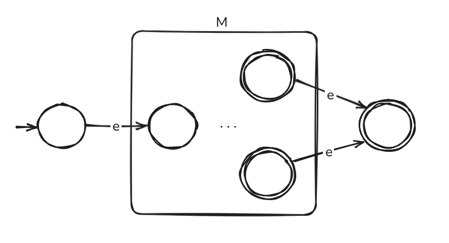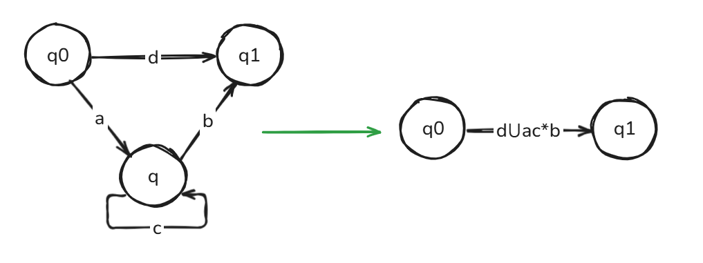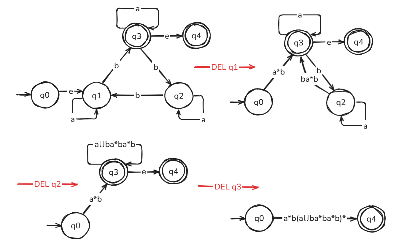 给定一个 NFA \(M\),要化简为正则表达式 \(R\),我们考虑为其手动新增一个初始状态和接受状态,用 e-transition 连接到原来的初始状态和接受状态,再逐一删除中间状态: