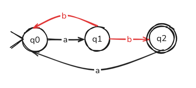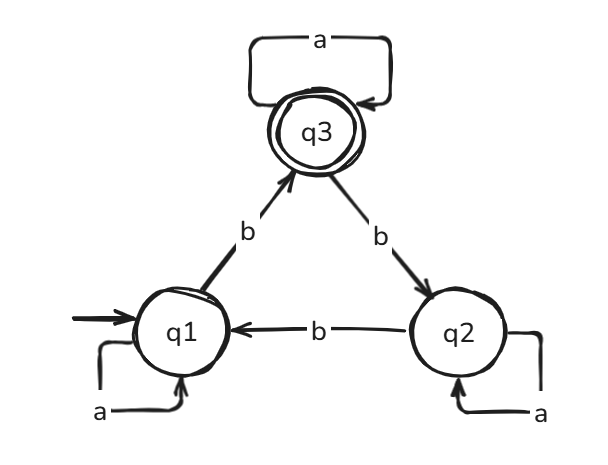 - \(a(a\cup b)^* b\) => \(\{w\in \{a,b\}^*\; :\; w \text{ starts with } a \text{ and ends with } b\}\)