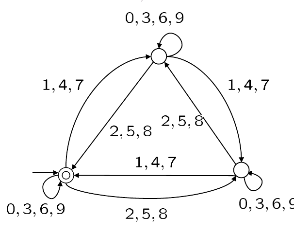 对于 \(L_3\),我们知道它的所有位数字加起来要是 3 的倍数,我们可以为它绘制一个 NFA: