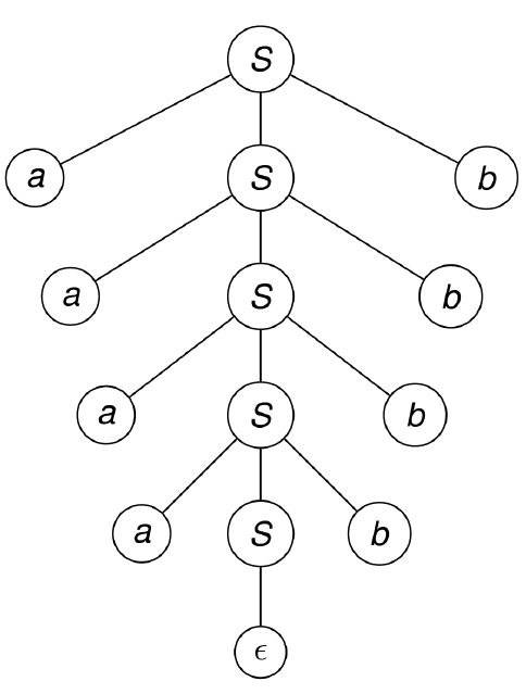 例如,对于 \(a^nb ^n\),可以绘制如下 parse tree 表示 \(a^4 b^r \in a^n b^n\):