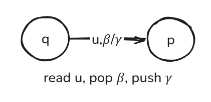 在表示上,我们在状态转移的箭头上新增一个项,表示我们从栈中 pop/push 了什么符号,例如 \(\left((p,u,\beta), (q,\gamma)\right)\in \Delta\):