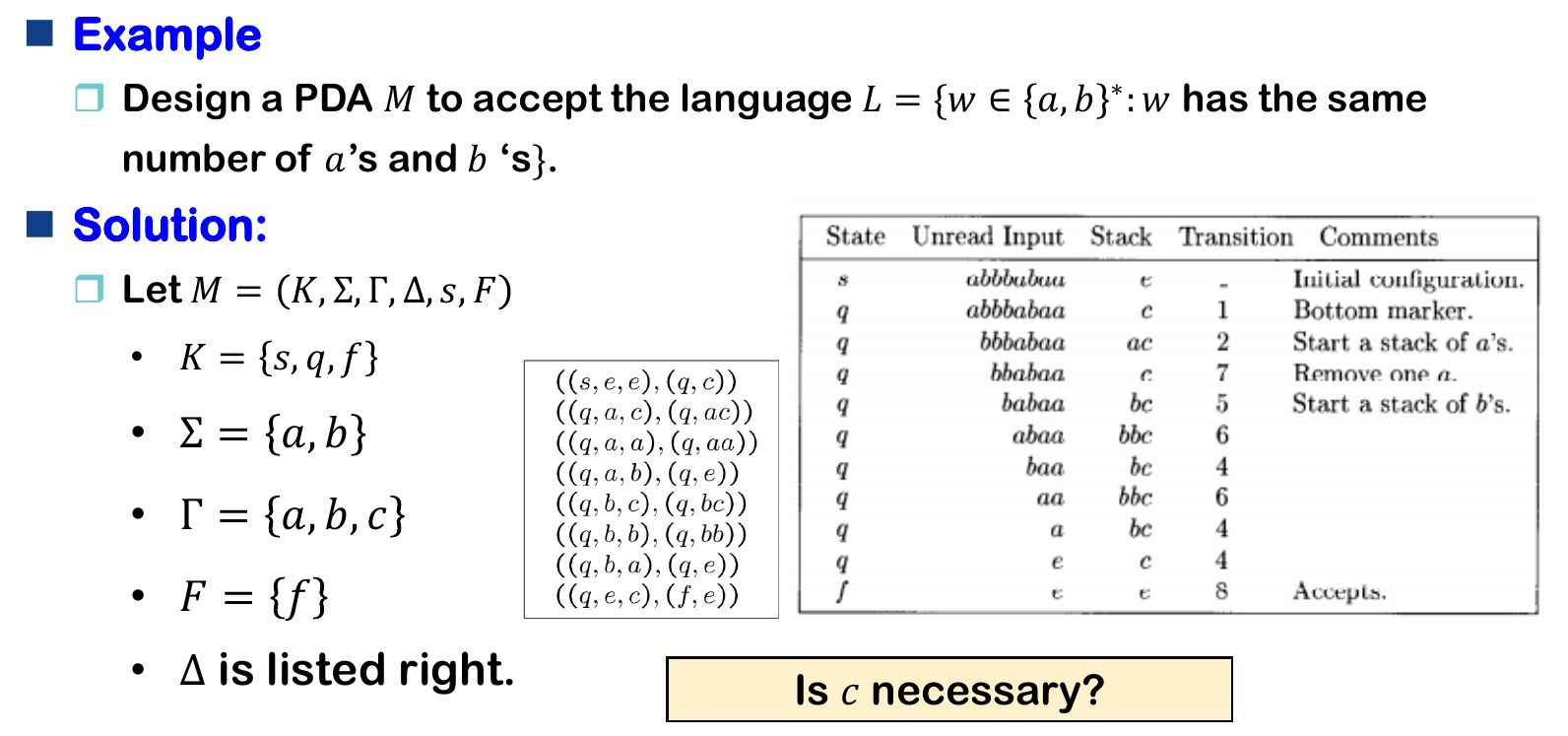 - \(\Delta \subseteq \left(K\times (\Sigma \cup \{e\})\times \Gamma^* \right)\times \left(K\times \Gamma^* \right)\)