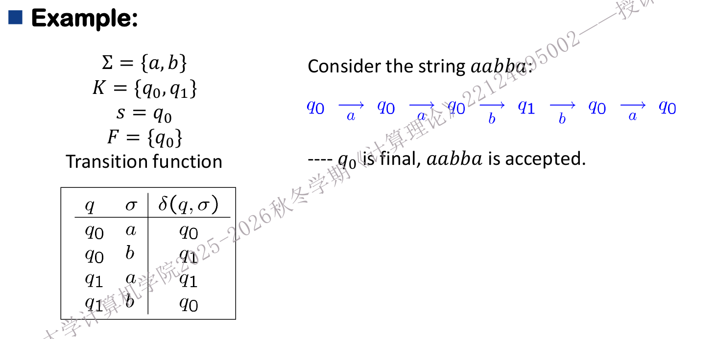 - Transition relation of DFA 一定是一个 function: \(K\times \Sigma \times K\)