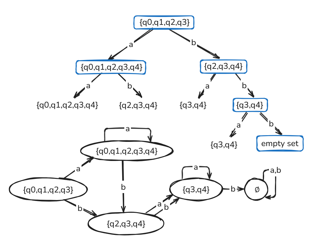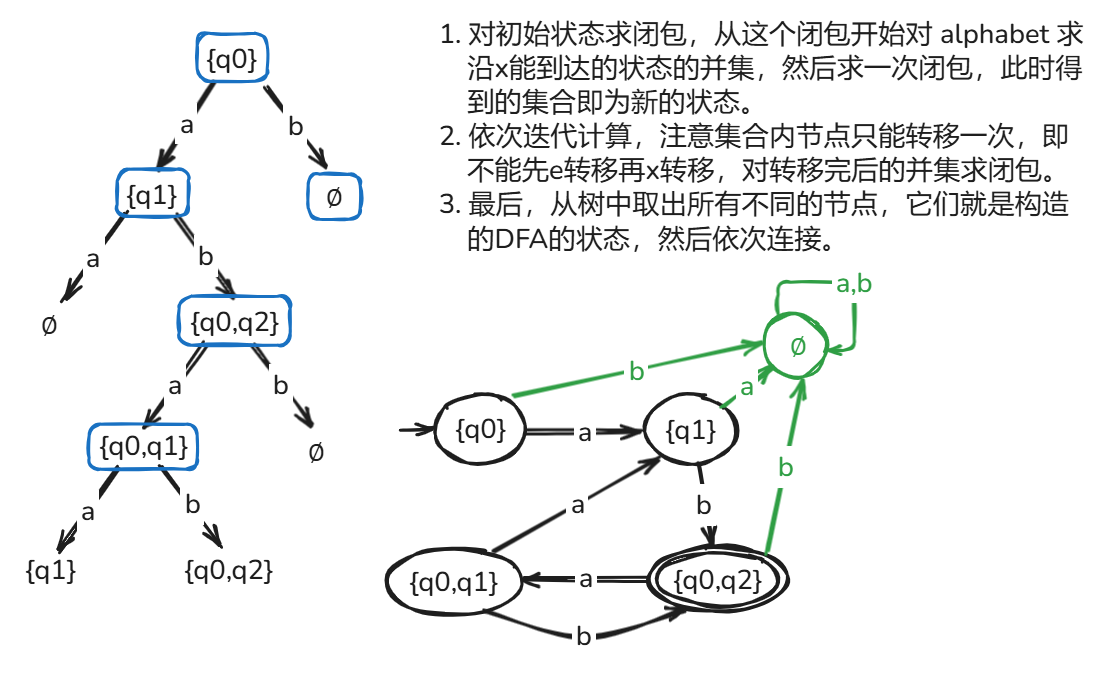 为了解决以上两点 Difference,我们可以从初始状态开始思考,计算转换后的 DFA 有什么状态。我自己思考总结得到的计算方法如下:
